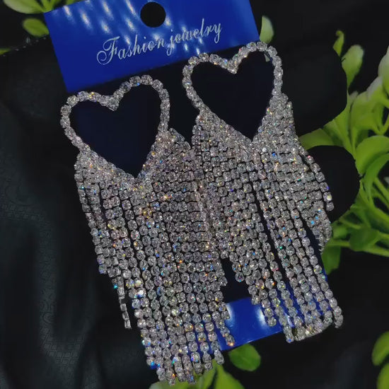 Elevate your look with these stunning heart-shaped long earrings adorned with sparkling rhinestones and a flowing fringe design. Expertly crafted and tarnish-free, these earrings ensure lasting brilliance and durability. Perfect for parties, weddings, or any glamorous occasion, they add a touch of elegance and charm to your ensemble. A must-have accessory to make a bold style statement!