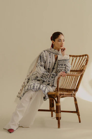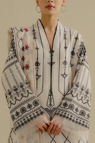 A crisp white lawn piece lifted with bold, playful embroidery in vibrant tones, finished with a cotton silk dupatta that adds a smooth, graceful layer to the look.