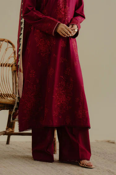 The ensemble is a monotone floral chikankari embroidery delicately sprayed across a rich red lawn base, styled with a matching silk dupatta that flows with quiet confidence.