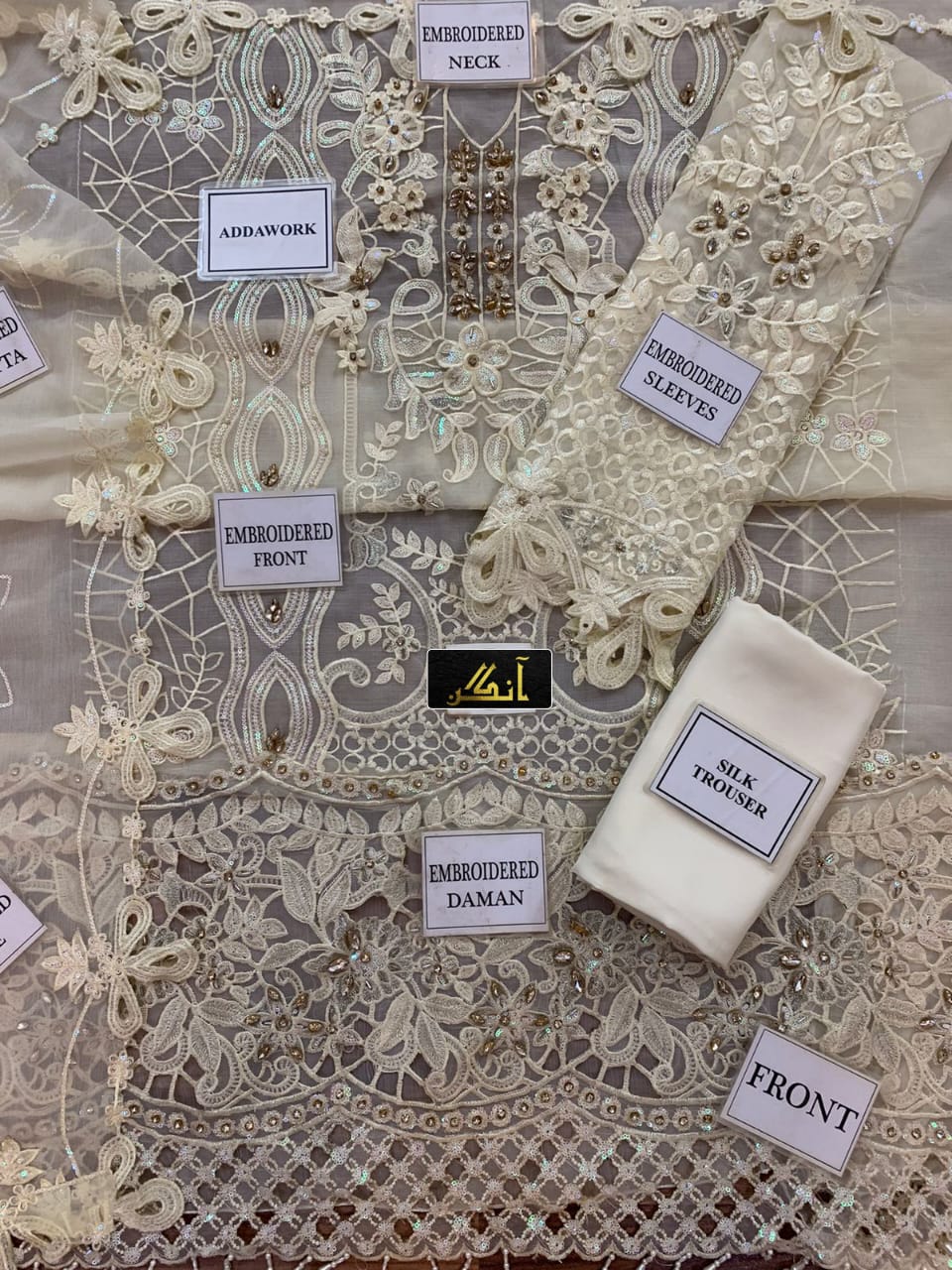 * → front: chiffon embroidered adda work & 3d flowers