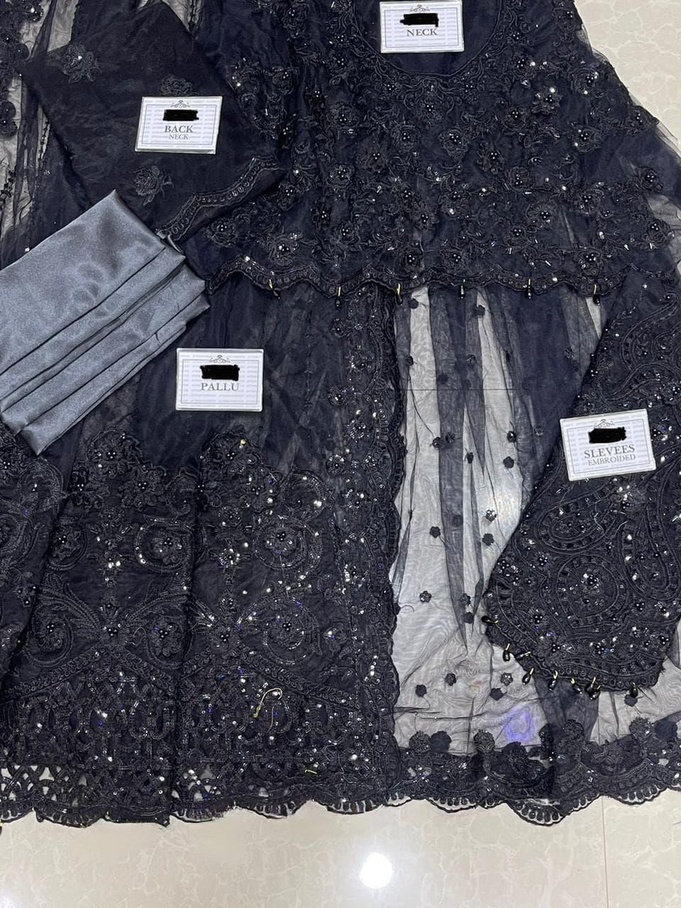 * sleeves: net adda work, cutwork hanging tussles